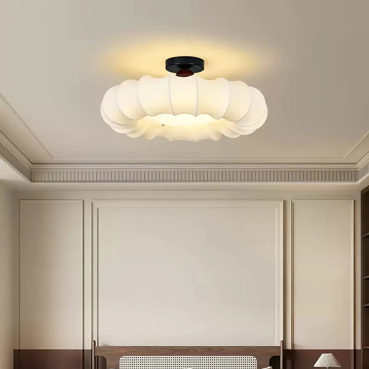 La lampada da soffitto Cemovelle aggiunge dolcezza ed eleganza a ogni ambiente. Il design nuvoloso con linee ondulate e fluide diffonde un bagliore caldo e accogliente, perfetto per la camera da letto, il soggiorno o gli spazi creativi. Il paralume color crema si abbina con stile a una piastra da soffitto nera e a una sottile venatura legnosa, creando un'armoniosa fusione di moderno e naturale. Grazie all'illuminazione LED integrata, potrai godere di una luce duratura e nitida che si adatta sia agli stili d'arredo caldi che a quelli neutri.