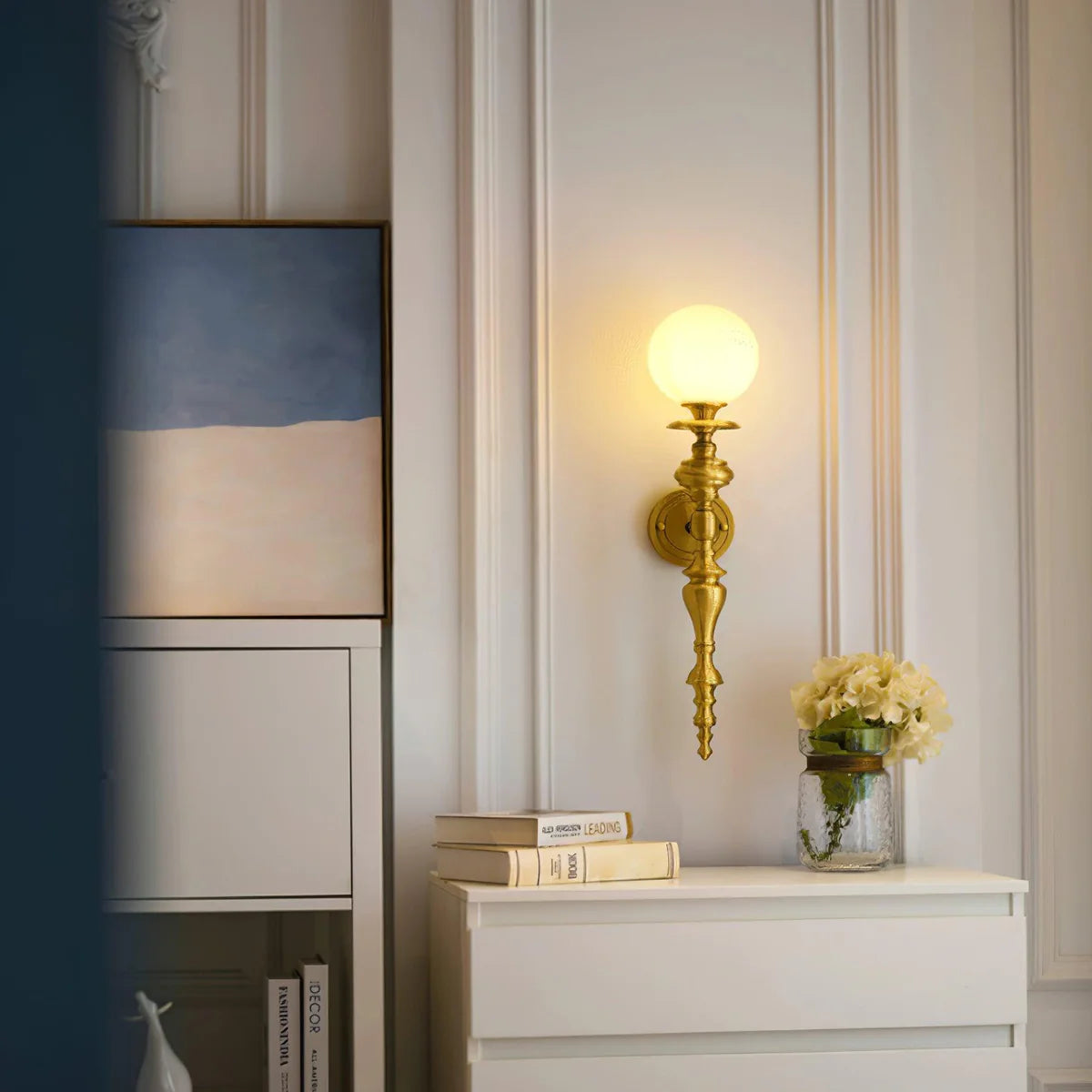 De Solviera Wandlamp straalt elegantie en luxe uit dankzij de combinatie van messing en glas. Met haar verfijnde ontwerp en klassieke gouden afwerking vormt deze wandlamp een stijlvolle toevoeging aan zowel moderne als traditionele interieurs. De witte glazen kap verspreidt een zachte, warme gloed die iedere ruimte een uitnodigende sfeer geeft. Ideaal voor gebruik in woonkamers, slaapkamers of gangen waar sfeervolle en functionele verlichting gewenst is. De Solviera Wandlamp is perfect voor wie zijn interieur een tijdloze uitstraling wil geven met een vleugje grandeur.