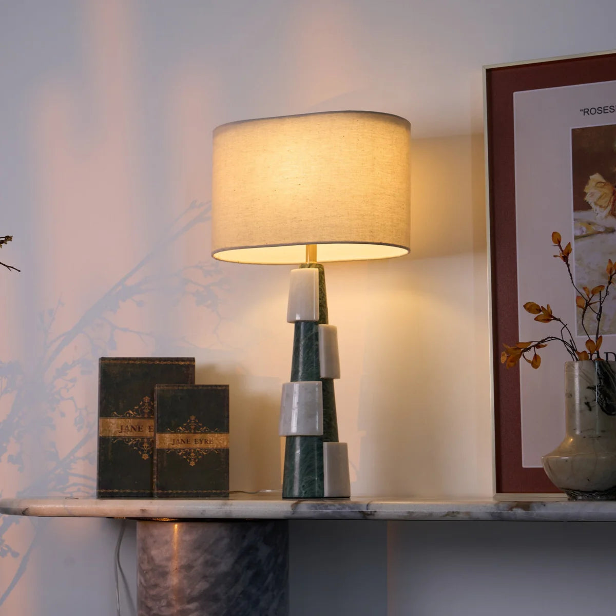 De Descumo Marmeren Tafellamp combineert moderne elegantie met natuurlijke materialen en vormt daarmee een stijlvol accent in iedere woonruimte. De gestapelde marmeren voet in groen en wit geeft de lamp een sculpturale uitstraling, terwijl de grijze stoffen kap het licht zacht en sfeervol verspreidt. Dankzij de E26/E27-fitting kun je eenvoudig kiezen tussen een LED-lamp of een Edison-lamp. De inline aan/uit-drukknop en touch-functie maken de bediening gemakkelijk en gebruiksvriendelijk. Met zijn unieke vormgeving en warme uitstraling is de Descumo Tafellamp ideaal voor slaapkamers, woonkamers en stijlvolle werkplekken.