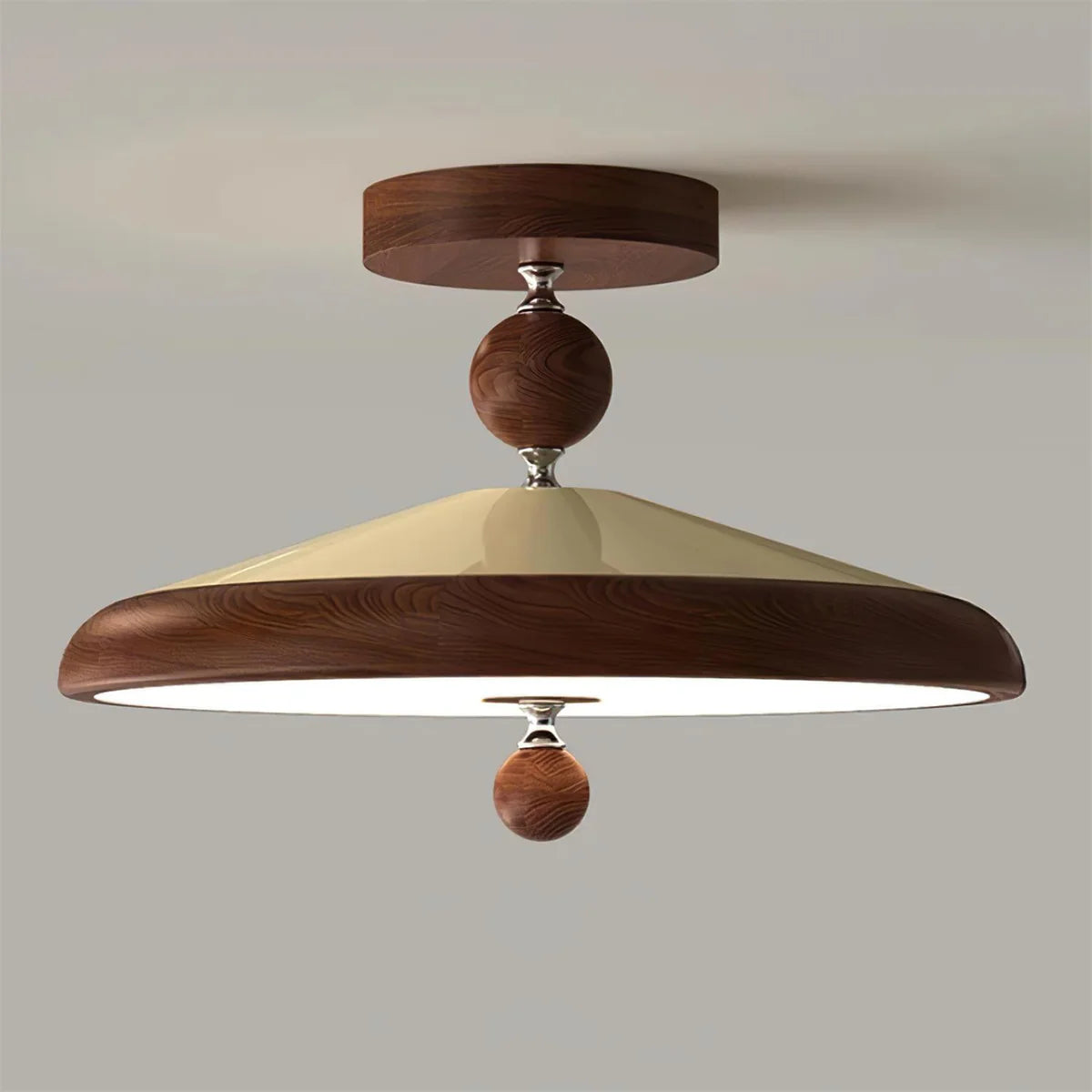 De Telisoma Plafondlamp combineert modern design met een vleugje vintage charme. Het metalen frame met hout- of zwartlook afwerking en de brede conische kap zorgen voor een warme en sfeervolle lichtverspreiding. Dankzij de geïntegreerde LED-technologie geniet je van energiezuinige verlichting met een lange levensduur van 50.000 branduren. De subtiele balanssferen geven de lamp een sculpturaal karakter, waardoor hij niet alleen functioneel is, maar ook een decoratief element in je interieur. Perfect voor de woonkamer, eetkamer of hal, waar stijl en sfeer samenkomen.