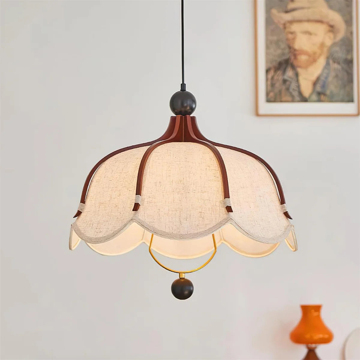 De Merrinage Hanglamp vangt de essentie van vintage elegantie en combineert dit met een moderne uitstraling. Het stevige houten frame buigt sierlijk over de zachte stoffen kap, waardoor een sculpturaal silhouet ontstaat dat doet denken aan bloeiende bloembladeren. De warme tinten en vloeiende vormen verspreiden een zacht en diffuus licht dat elke ruimte een serene en sfeervolle uitstraling geeft. Ideaal voor boven de eettafel, in de woonkamer of in klassieke interieurs waar een vleugje nostalgie gewenst is. Met de mogelijkheid tot dimmen en compatibiliteit met LED biedt de Merrinage Hanglamp veelzijdigheid Γ©n stijl.