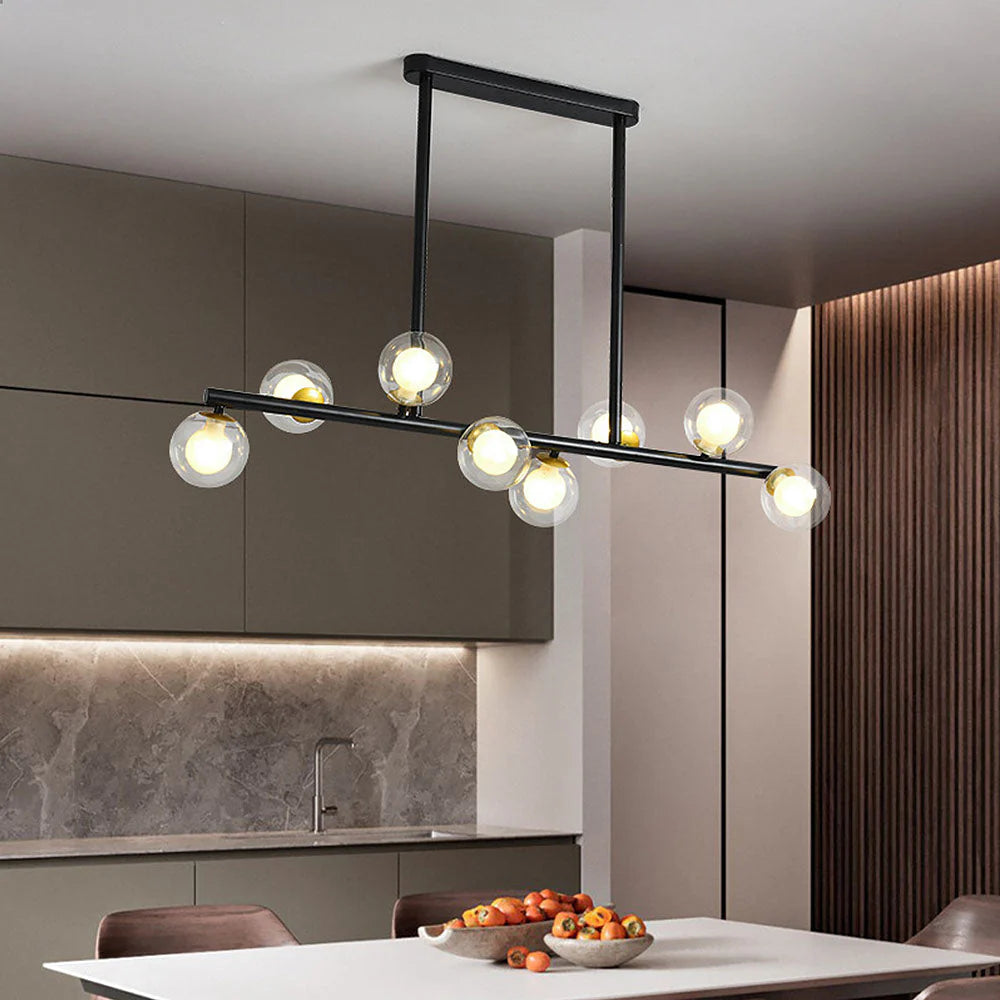 Breng een moderne sfeer in uw keuken of eetruimte met de Seraphis hanglamp. Deze stijlvolle plafondlamp combineert een slank zwart frame met ronde glazen bollen voor een speels, maar verfijnd effect. Perfect boven een keukeneiland of eettafel straalt deze hanglamp warm licht uit en voegt karakter toe aan uw interieur. Met een keuze uit 6, 8 of 10 lichtbronnen past de Seraphis hanglamp zich aan uw ruimte aan. De combinatie van glas en ijzer zorgt voor een elegante uitstraling, ideaal voor wie op zoek is naar een moderne plafondlamp met een bijzondere uitstraling. Geef uw keuken, eetkamer of woonkamer een upgrade met deze prachtige glazen hanglamp.