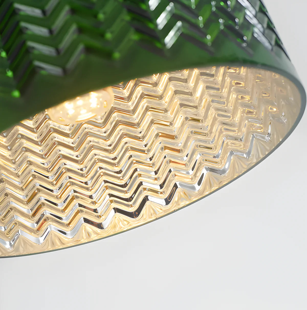 De Leravux hanglamp combineert elegantie en karakter met een retro-uitstraling dankzij het groene geribbelde glas en de messing afwerking. Deze glazen hanglamp is perfect als statement boven een eettafel, in een keuken of in een hal. De lamp is compatibel met LED-verlichting en biedt een warme, sfeervolle verspreiding van licht, ideaal voor ruimtes tot 10 m². Dankzij het stijlvolle ontwerp past deze lamp moeiteloos in zowel moderne als klassieke interieurs. De gouden details zorgen voor een luxueuze toets, terwijl het glaspatroon zorgt voor een mooie lichtreflectie. Kies uit meerdere vormen om je inrichting af te stemmen op jouw smaak.