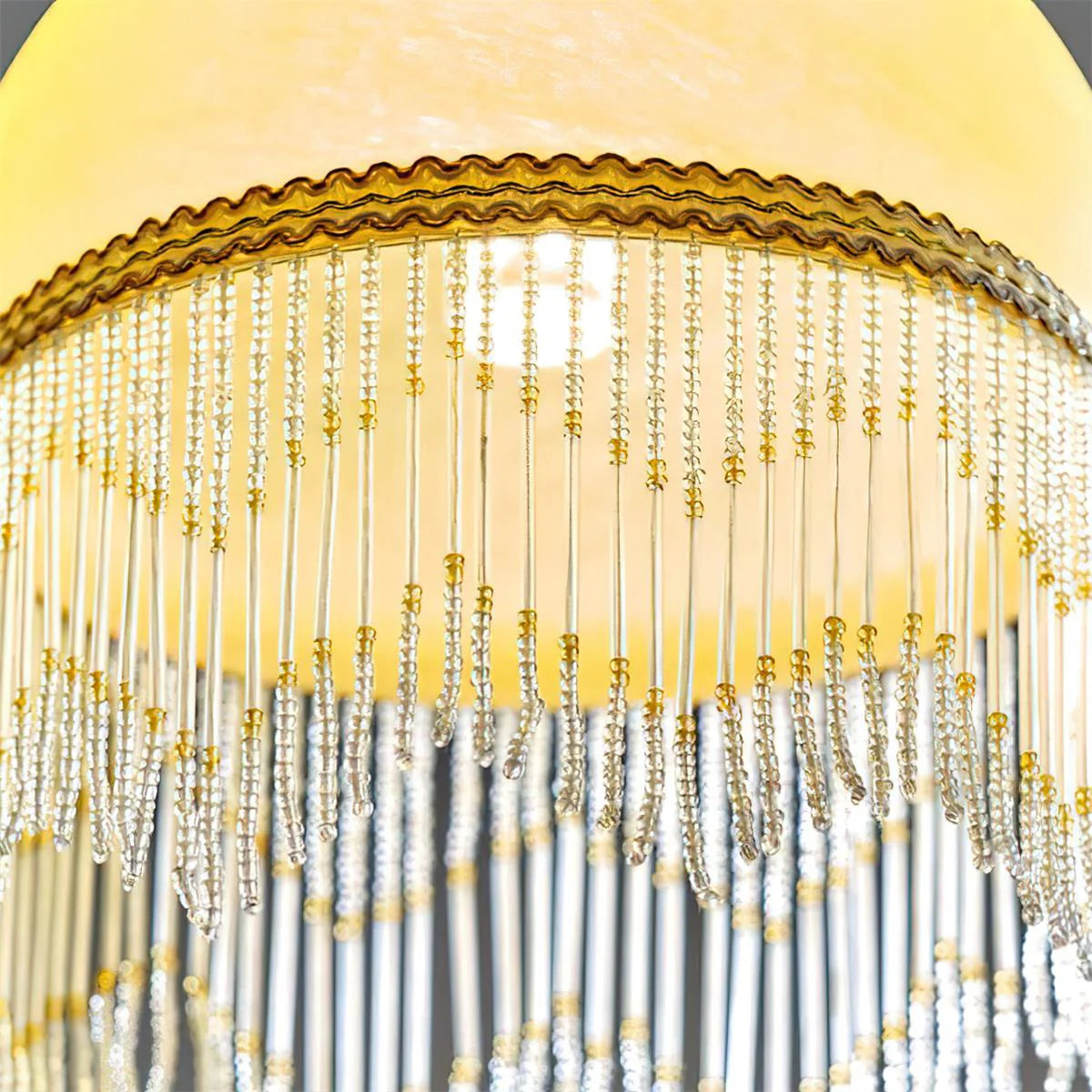 De Vitassel Hanglamp combineert vintage charme met een moderne touch. De zachte, gele glazen kap in koepelvorm verspreidt een warm en sfeervol licht, terwijl de fijne kralenfranjes zorgen voor een elegant en speels lichteffect. De messingkleurige bovenzijde geeft de lamp een klassieke uitstraling die perfect past in zowel moderne als retro interieurs. De Vitassel Hanglamp is een echte blikvanger boven de eettafel, in de woonkamer of in een sfeervolle slaapkamer.